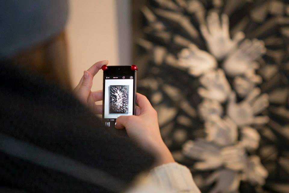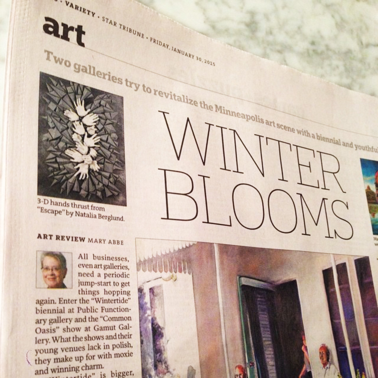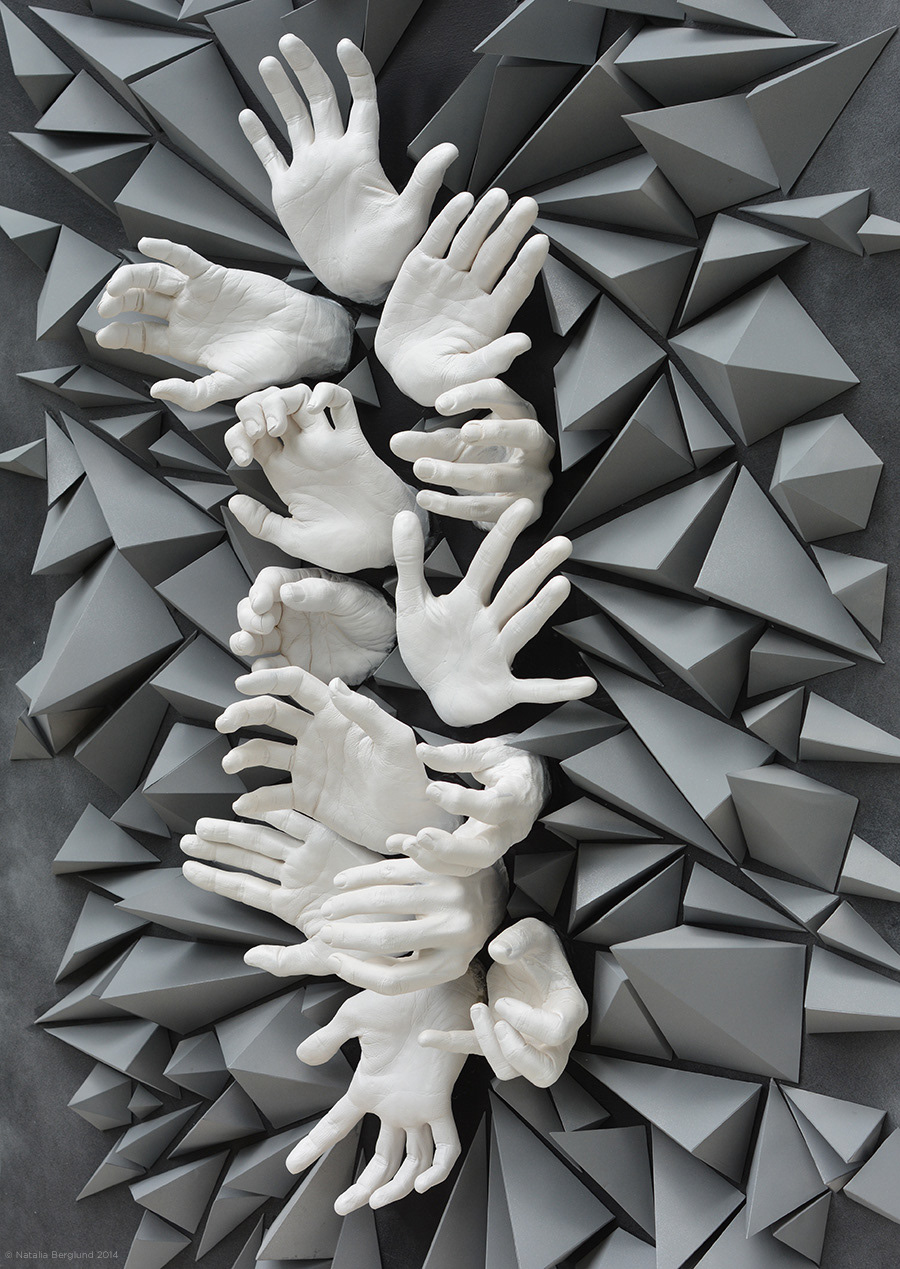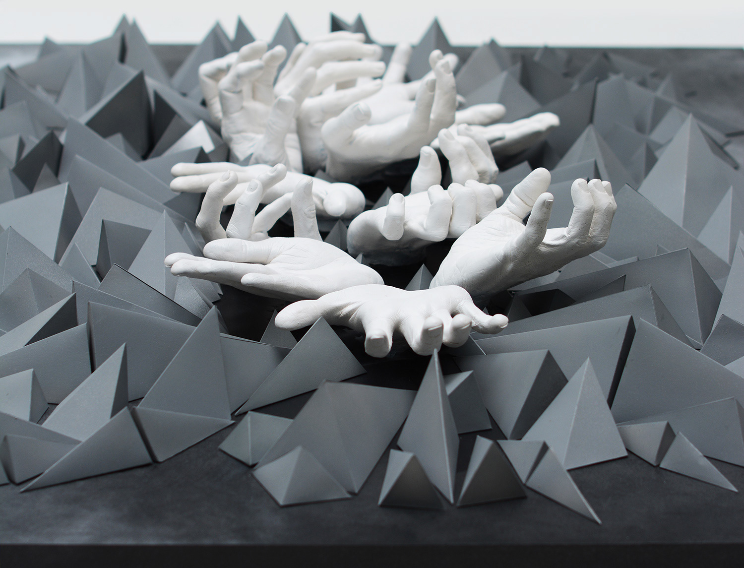 34×48″ wooden base, gypsum hands, paper pyramids. About 8″ deep.