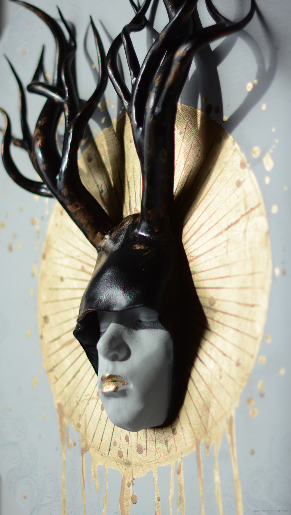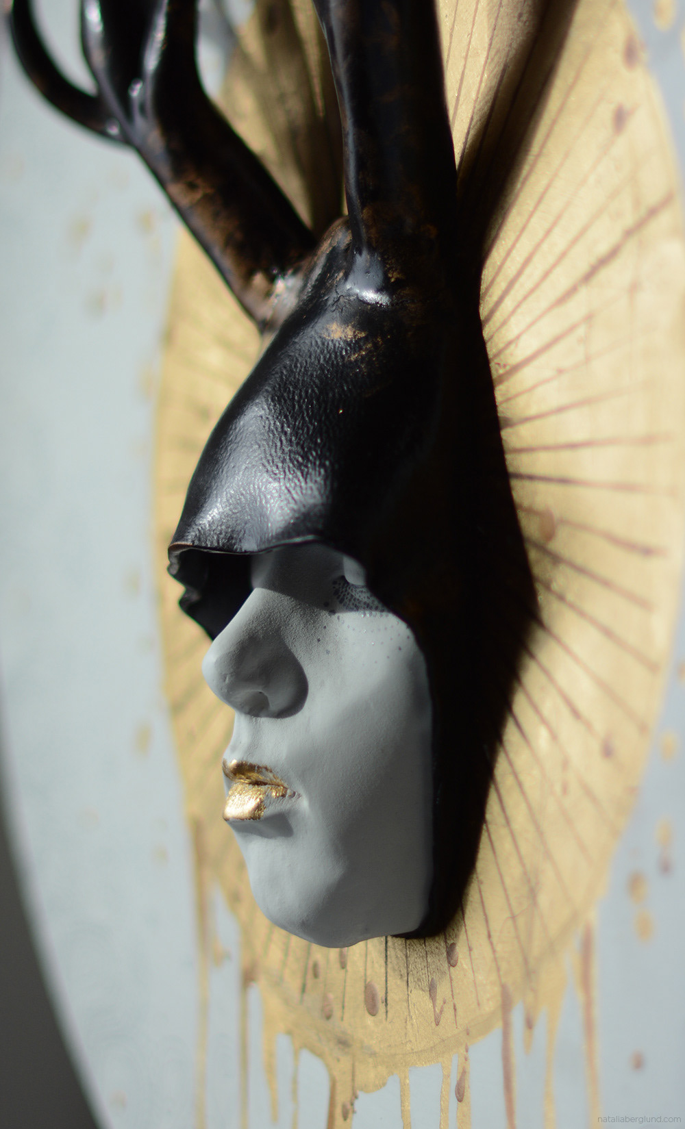 25″ wooden plate, face – gypsum, horns – polymer clay