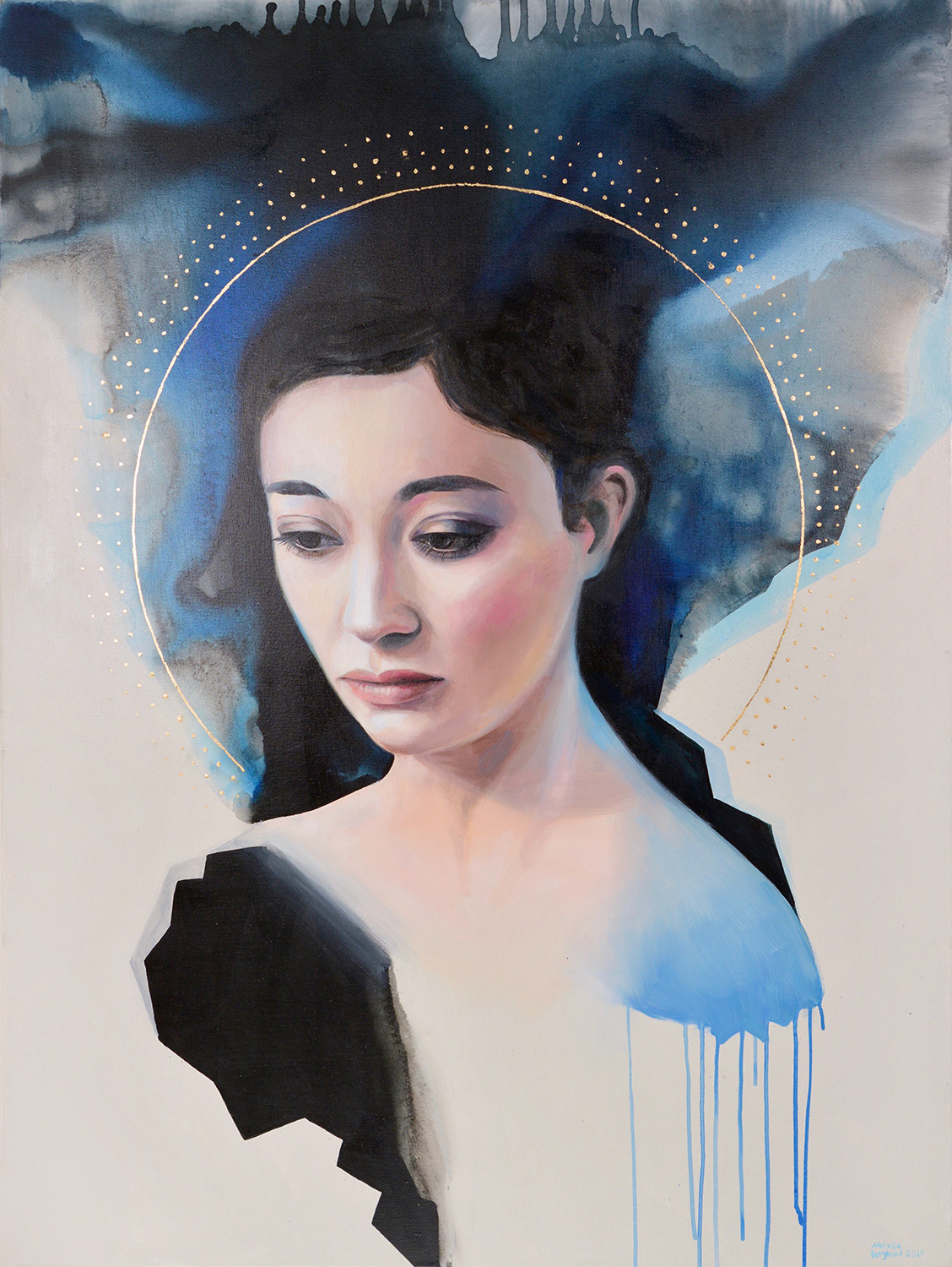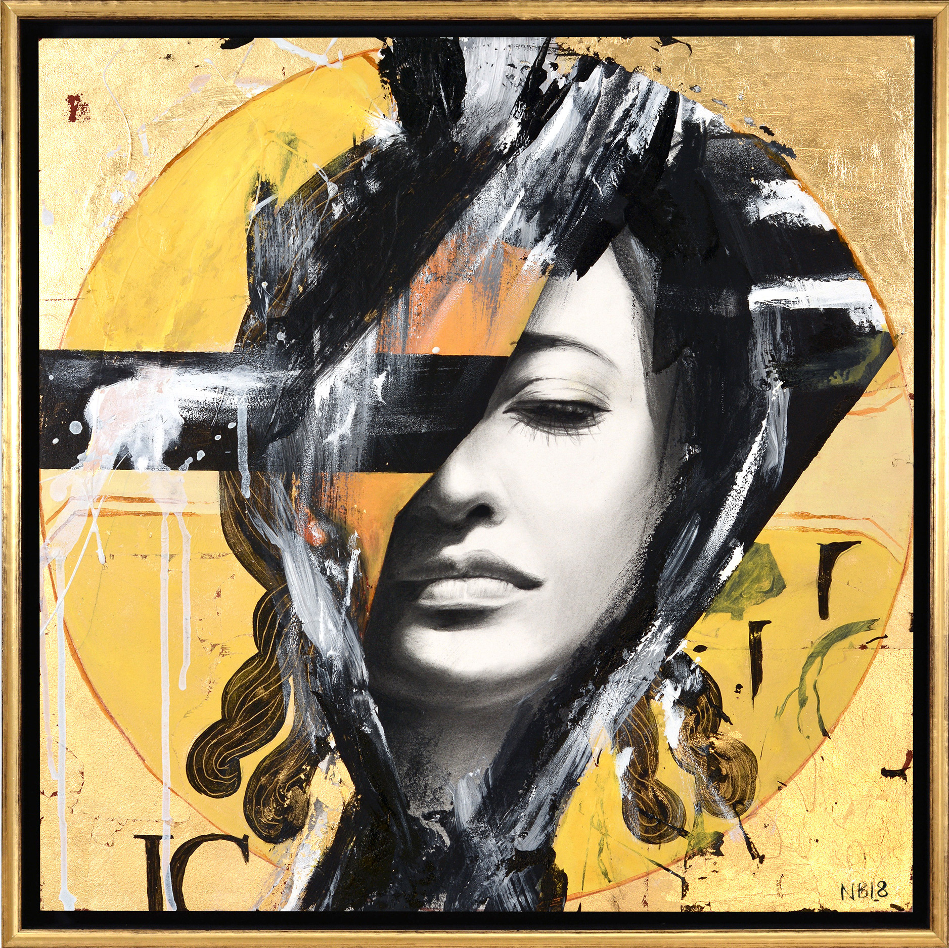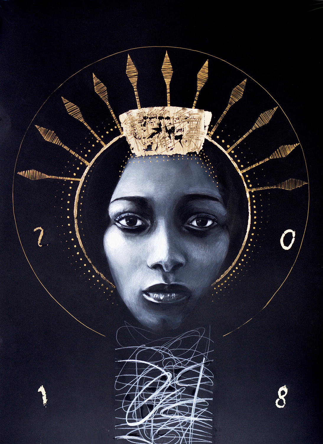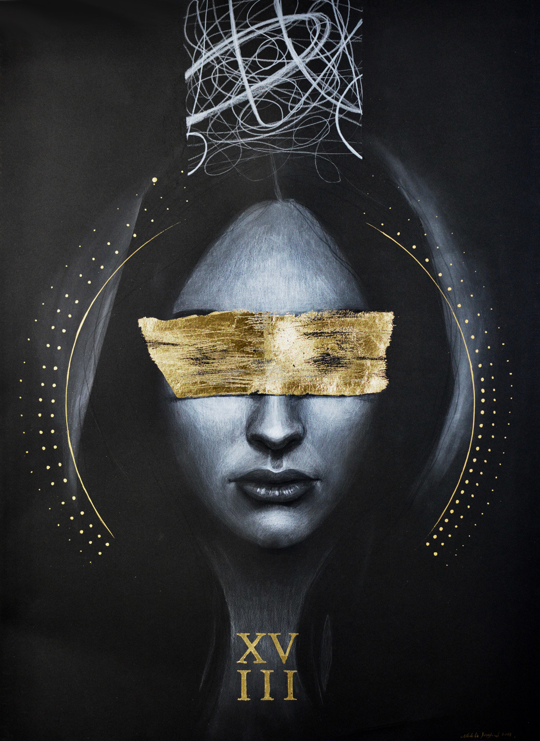 Hidden – 18×18″, graphite, ink, oil, gold leaf on wood panelPrivate collection